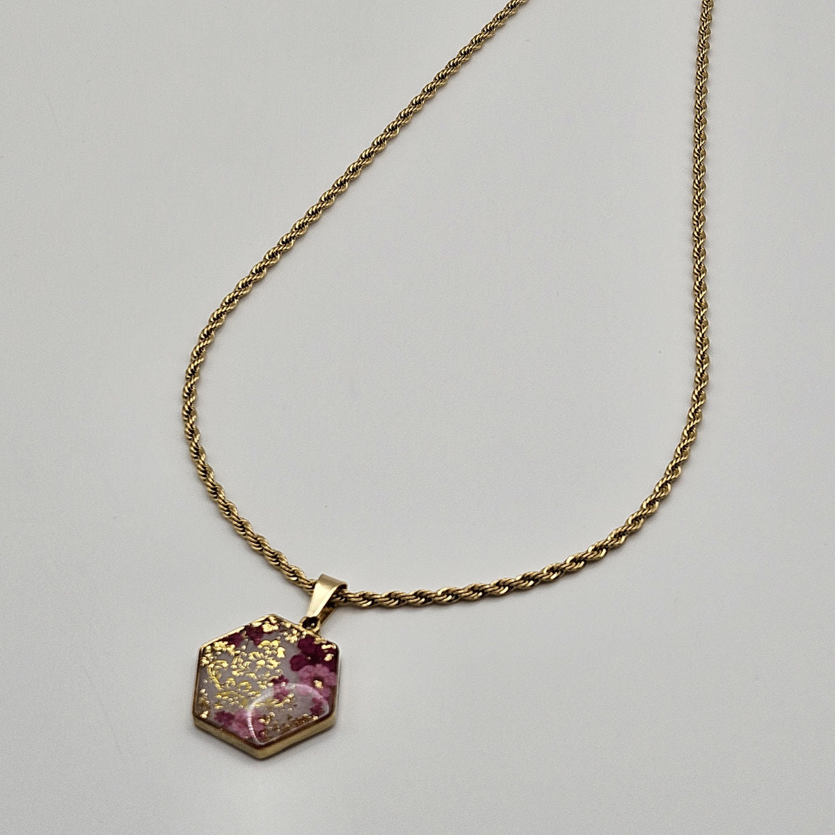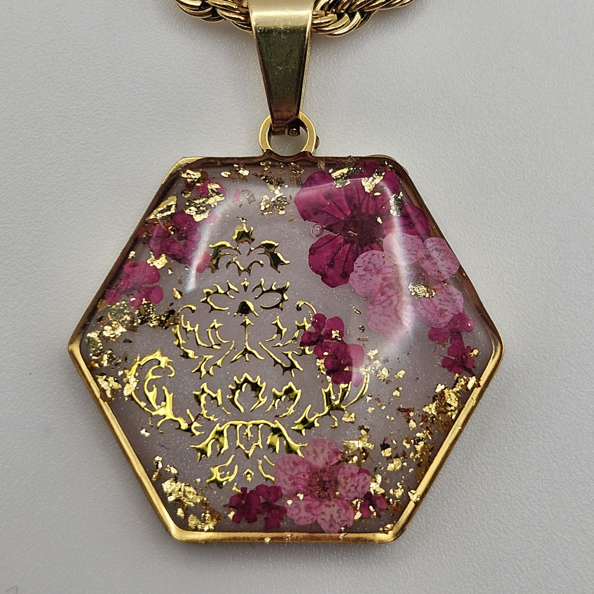 Collana con ciondolo esagonale in resina, fiori essiccati e dettagli dorati.