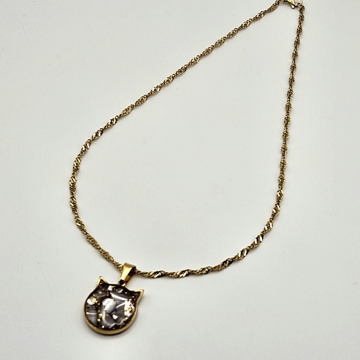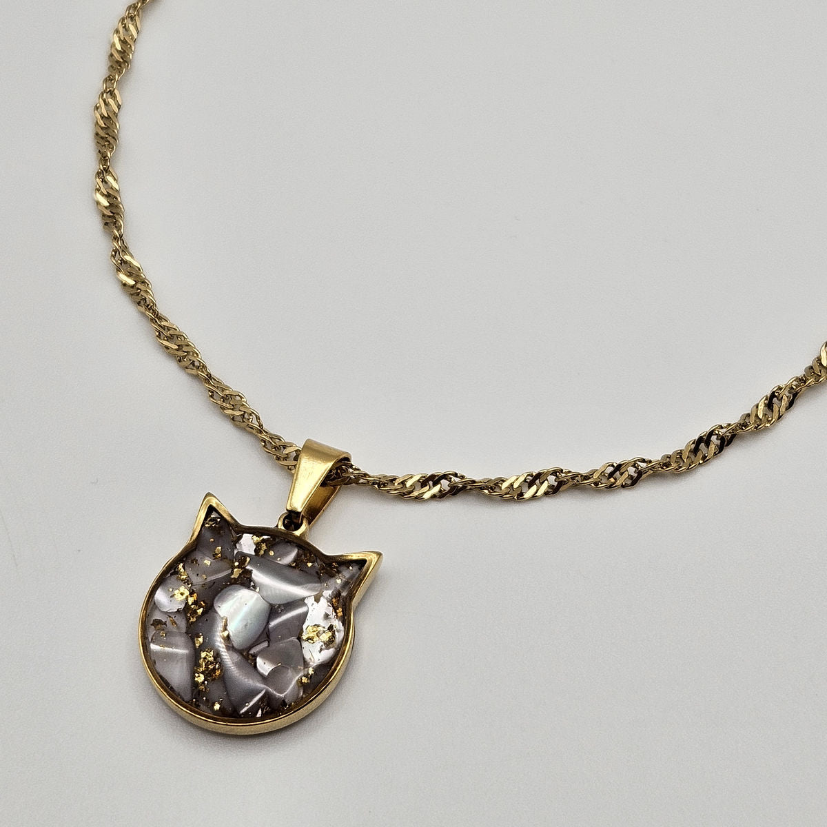 Un piccolo volto di gatto che cattura la luce grazie ai piccoli confettini di vera madreperla, creano vibrazioni morbide e ricercate.