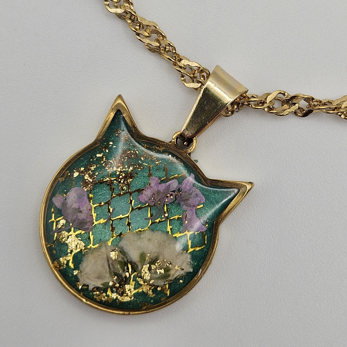 Ogni ciondolo è un pezzo unico fatto a mano. La resina verde smeraldo crea profondità, mentre i fiori e l'oro aggiungono vita e luminosità. La forma a gatto con orecchie rende questo pezzo riconoscibile e affettuoso, senza essere infantile.