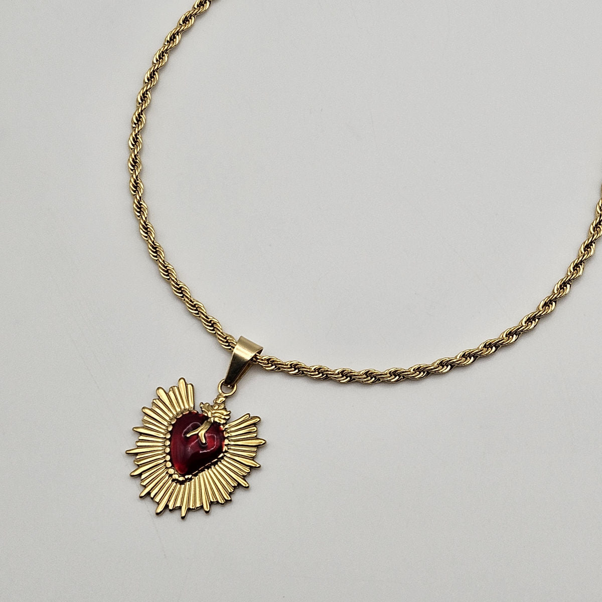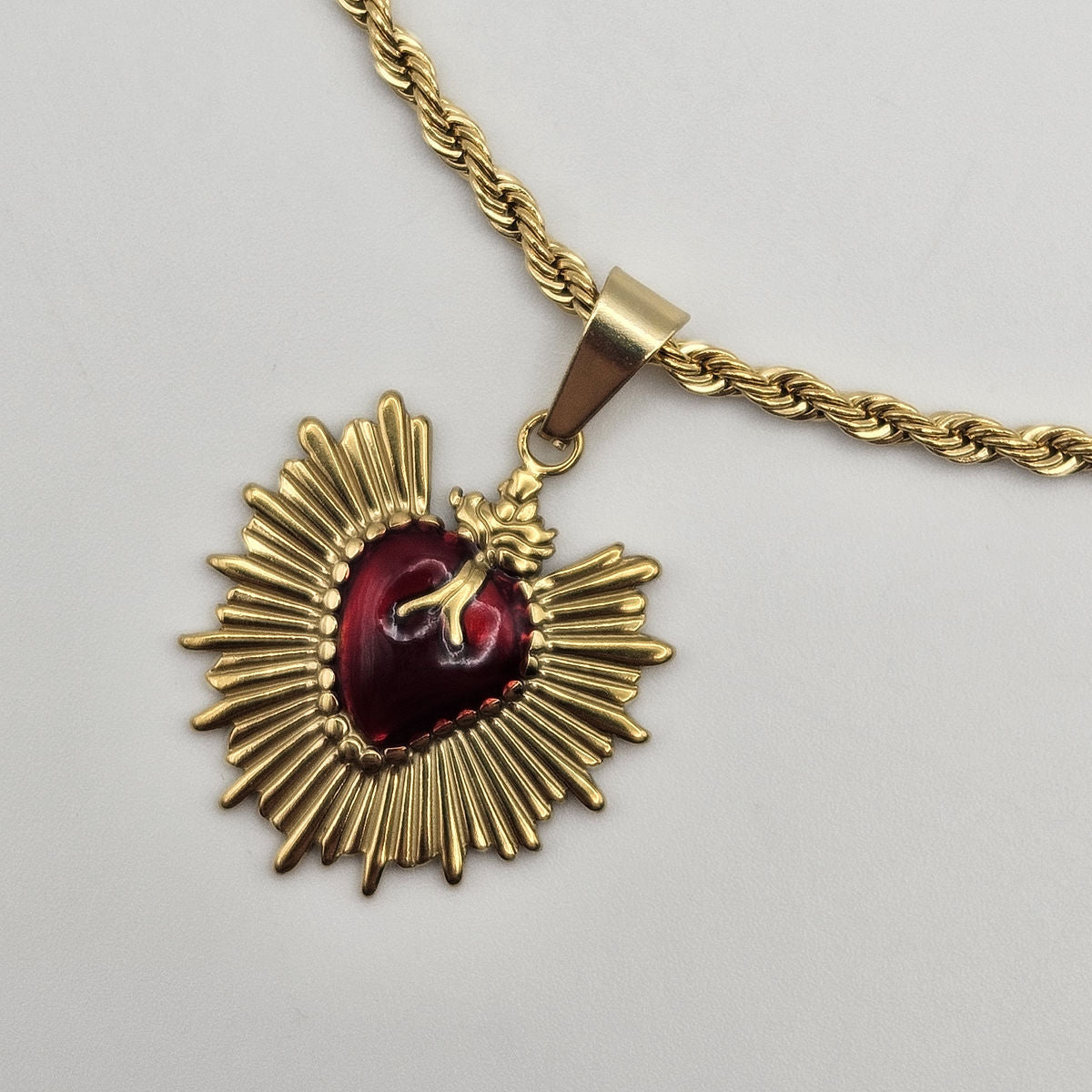 Un cuore rosso intenso circondato da raggi dorati che si irradiano come un sole. Il design barocco reinterpreta il simbolo del sacro cuore in chiave contemporanea, con smalto lucido e dettagli dorati che catturano la luce.