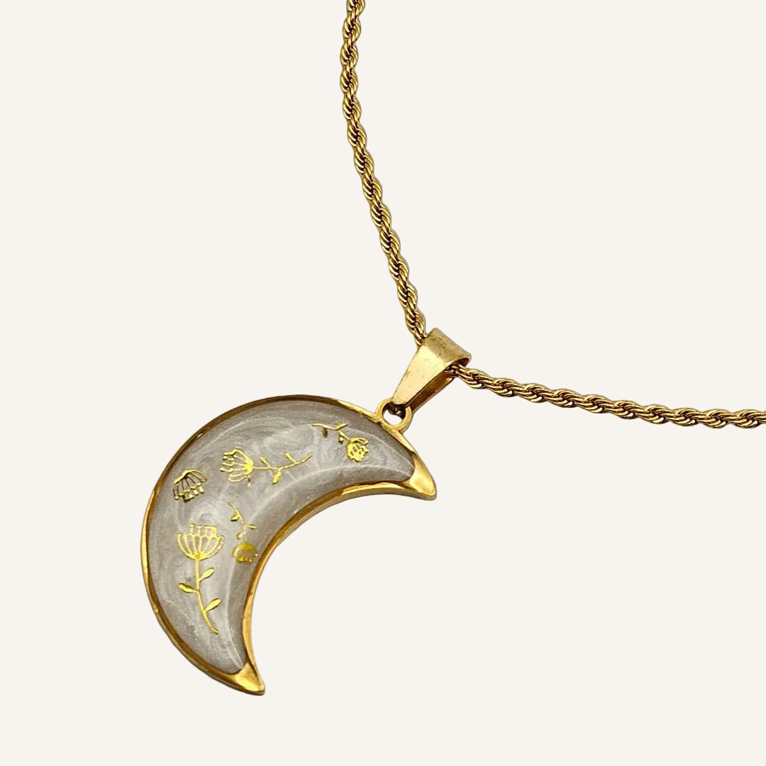 La collana Luna Fiorita è realizzata a mano in resina perlata e impreziosita da piccole decorazioni dorate a forma di fiore.