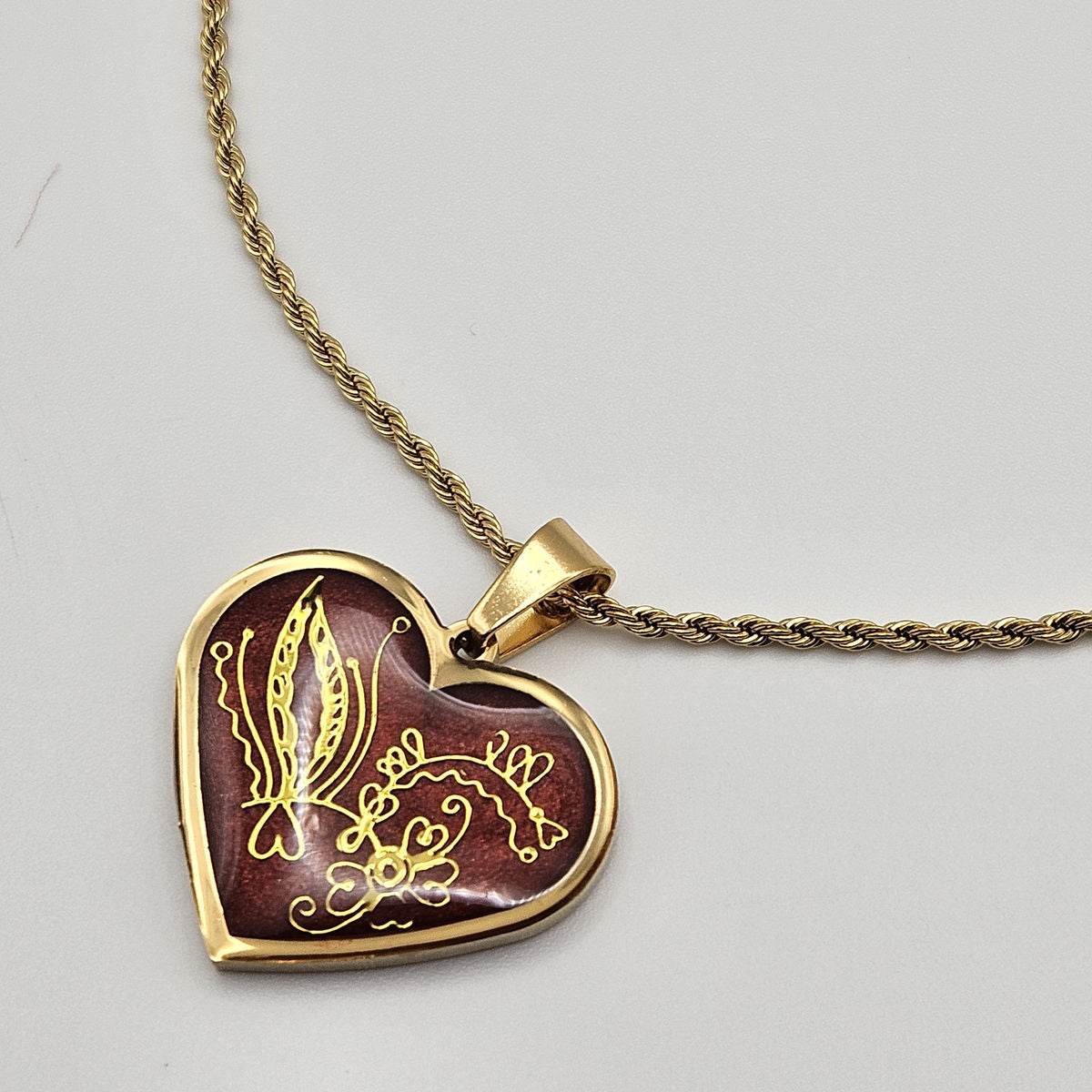 Un cuore in resina rosso, vibrante e luminoso, con un elegante simbolo dorato dal tratto antico.
