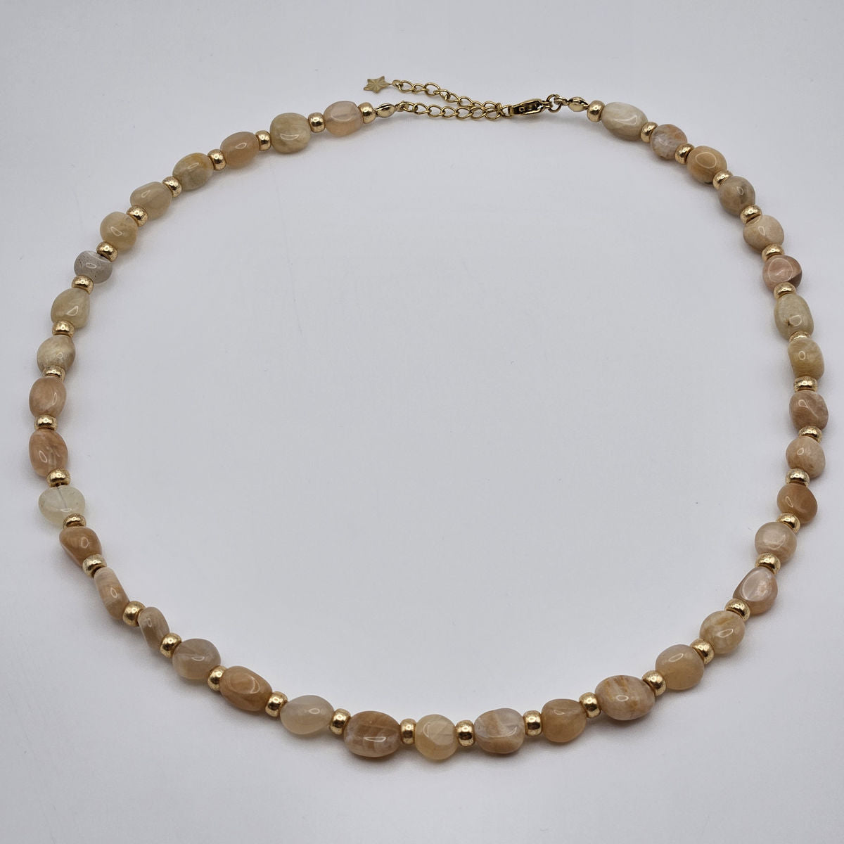 Sassolini irregolari di pietra di luna dai toni lattei e naturali, alternati a perline Miyuki dorate. Una collana dall'aspetto organico che valorizza la bellezza imperfetta della pietra naturale.