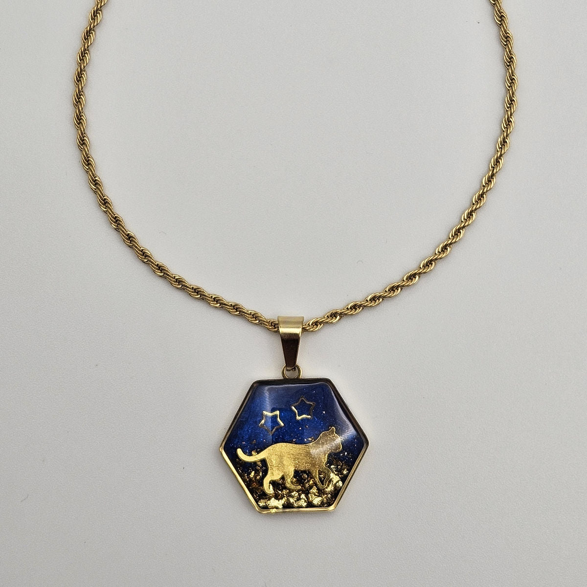 Porta sempre con te la magia della notte con questo ciondolo esagonale blu profondo, impreziosito da un micio dorato che cammina sotto le stelle.