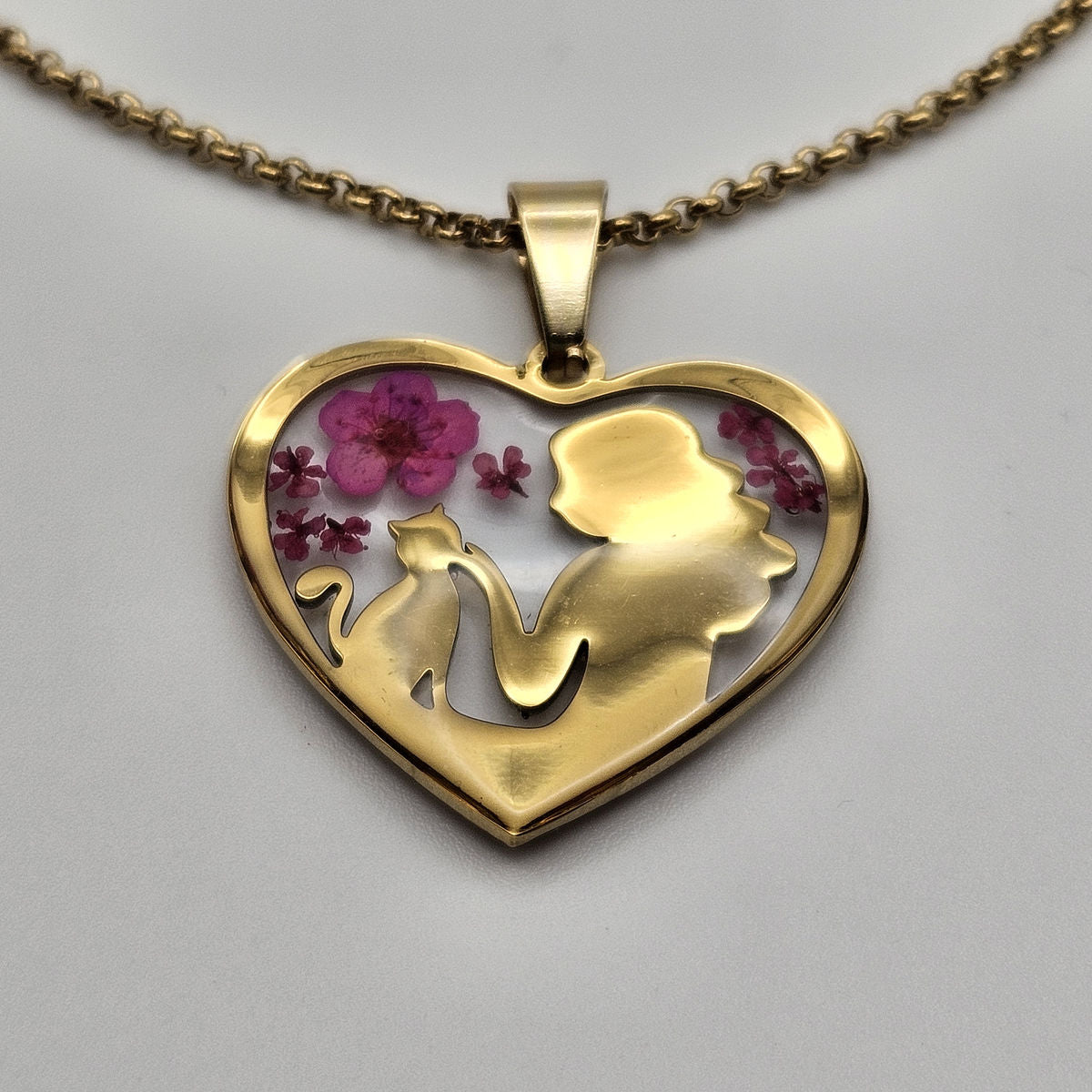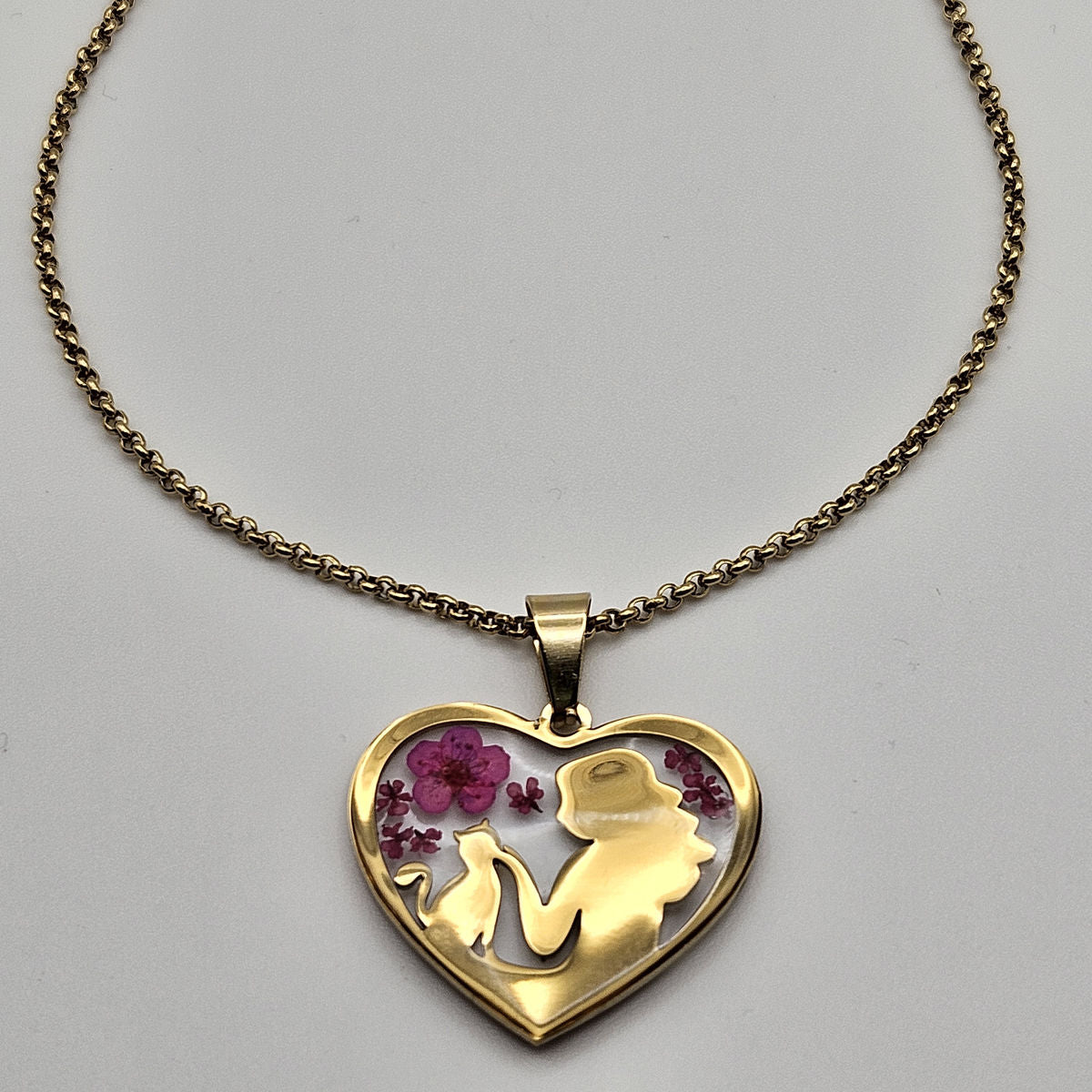 Collana con splendido ciondolo mamma umana e gattini in acciaio resina e fiori veri.