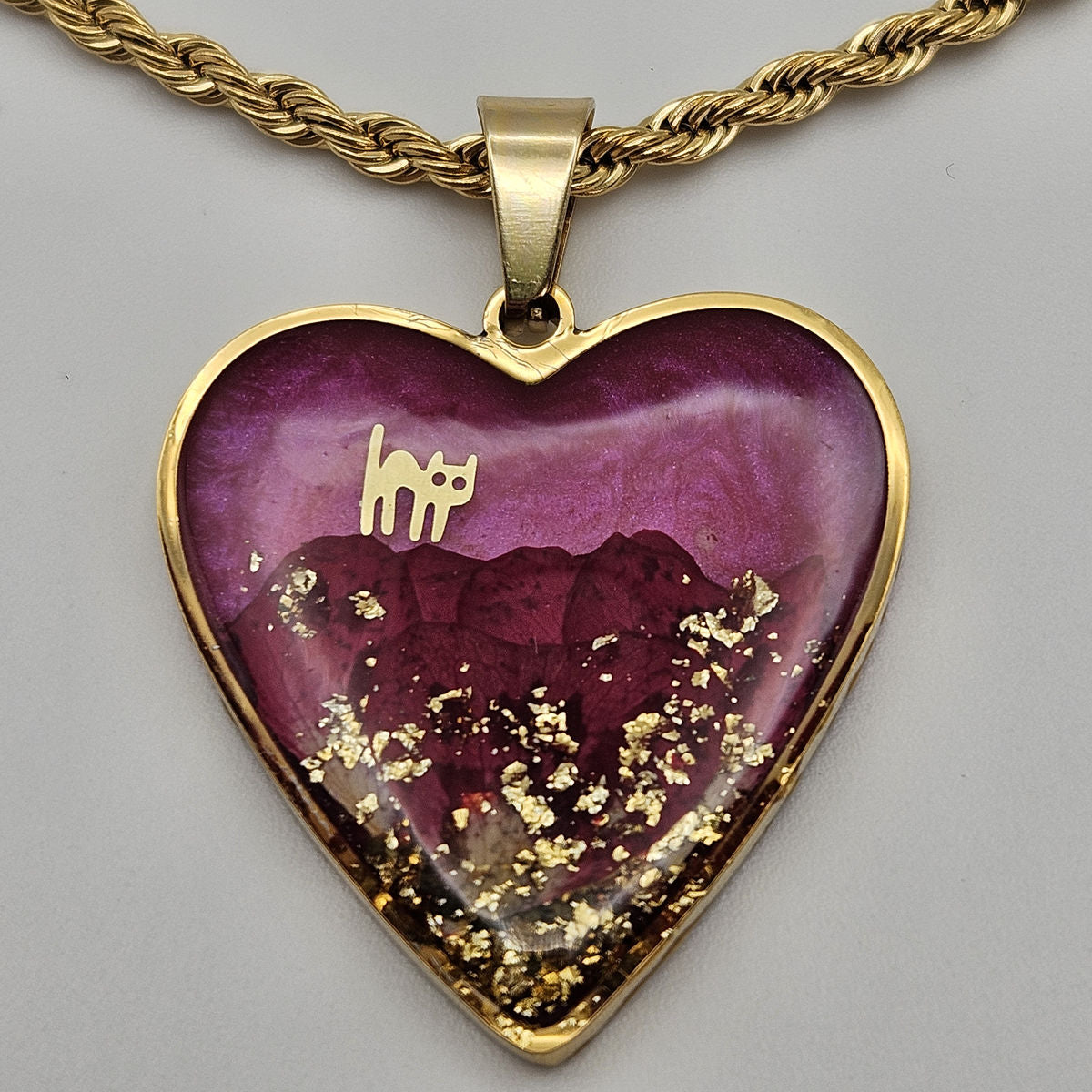 Un ciondolo a cuore che racchiude un piccolo paesaggio immaginario.