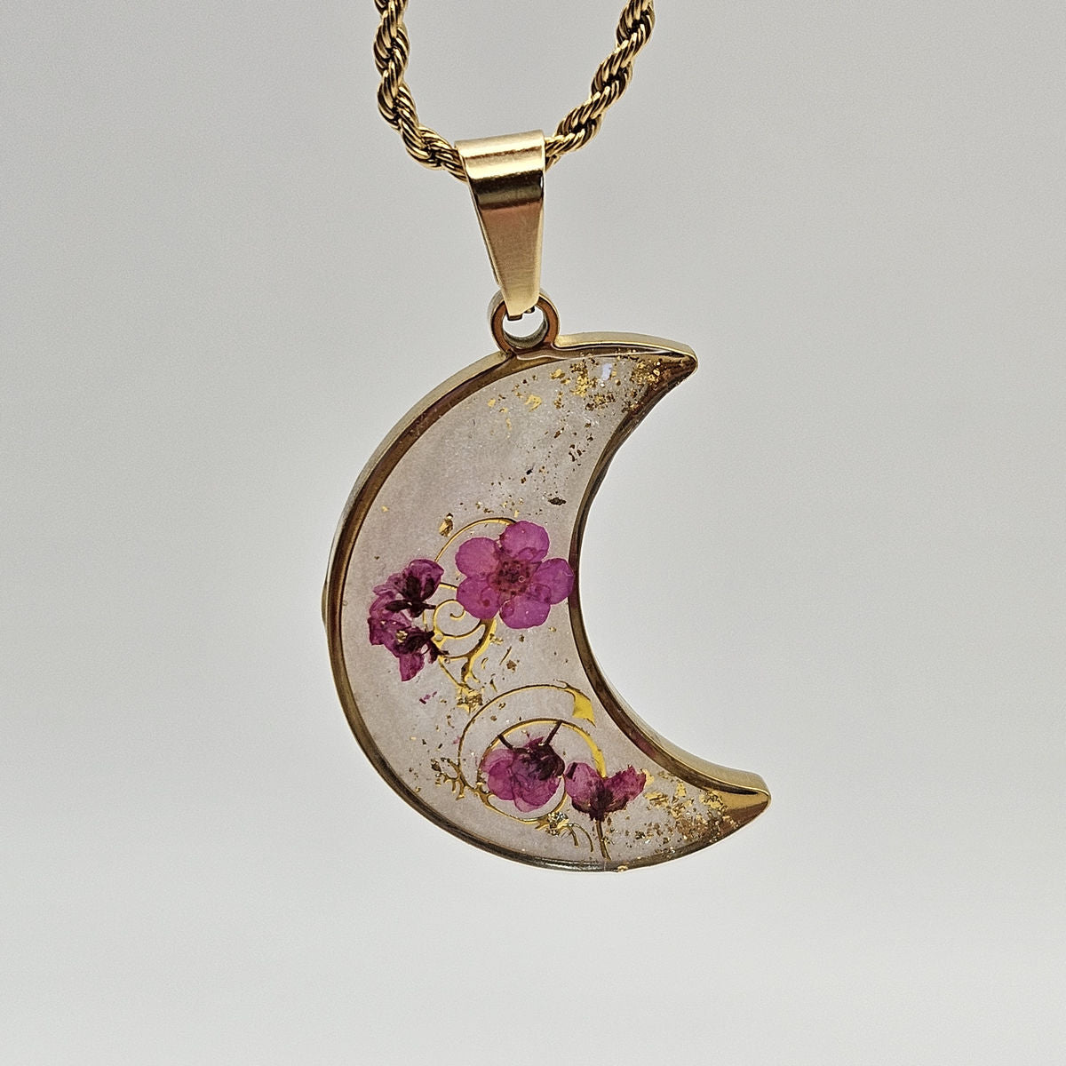 Le delicate venature dorate avvolgono i petali e si mescolano alla luce della resina perlescente, creando un riflesso morbido e sognante.